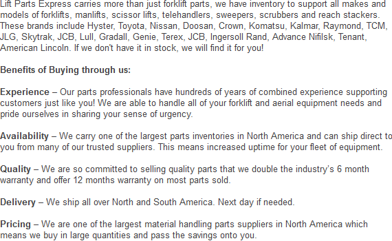 We have first-rate prices on all our lift-truck parts. For a price estimate on an attachment or part we offer, please call us at:
